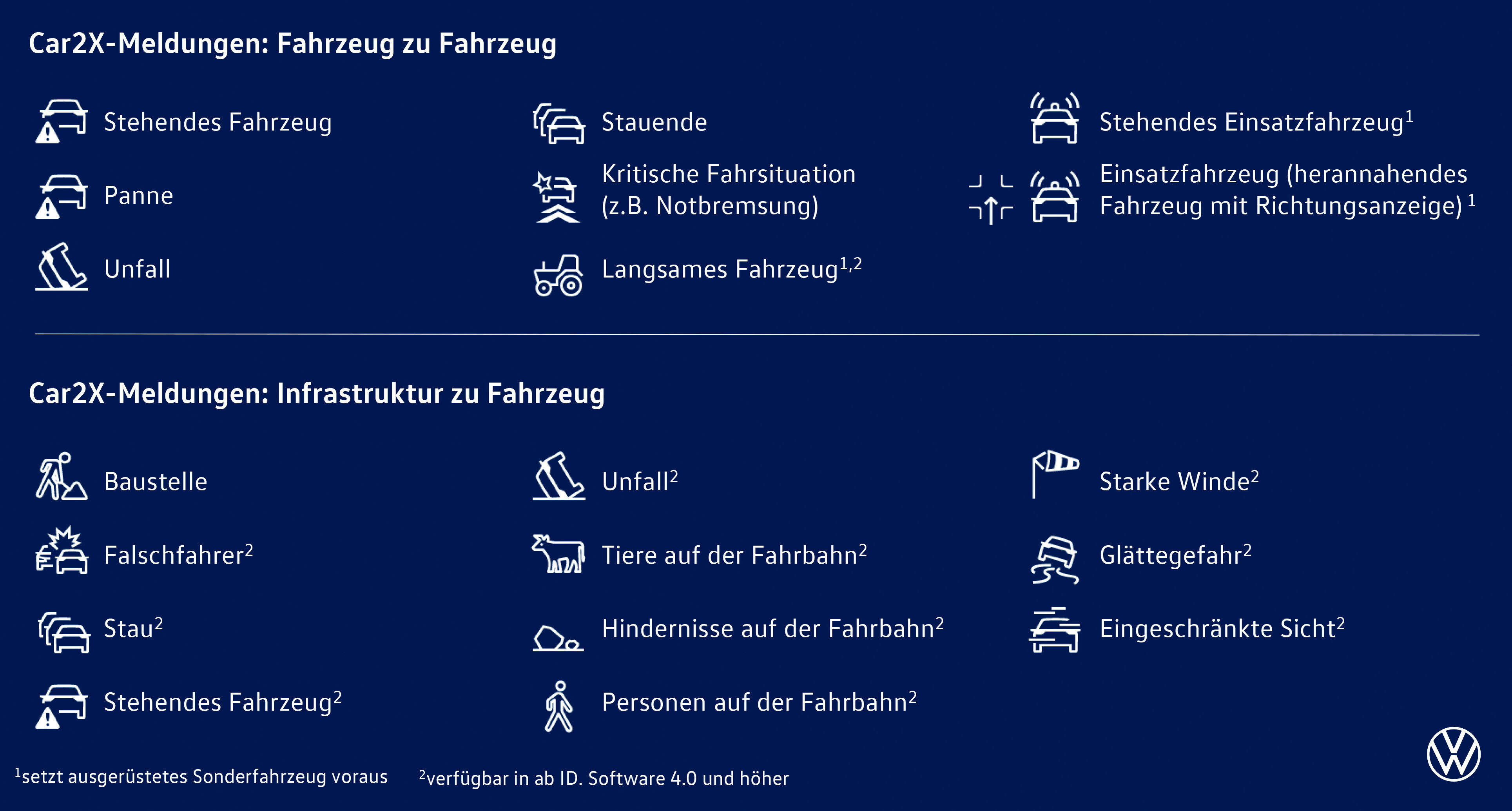 Mit inzwischen über zwei Millionen produzierten Volkswagen Modellen mit Car2X-Technologie entsteht in Europa ein Netzwerk, das Verkehrssituationen schneller erkennbar und den Straßenverkehr sicherer machen soll. Die Fahrzeuge tauschen direkt und ohne Mobilfunk über WLANp in Echtzeit Informationen aus. So entstehen Warnungen bei Gefahrensituationen wie etwa bei plötzlich auftauchenden Stauenden, Notbremsungen oder herannahenden Einsatzfahrzeugen. Das Assistenzsystem "Gefahrenwarnung" nutzt diese Daten und zeigt Hinweise im digitalen Cockpit an.